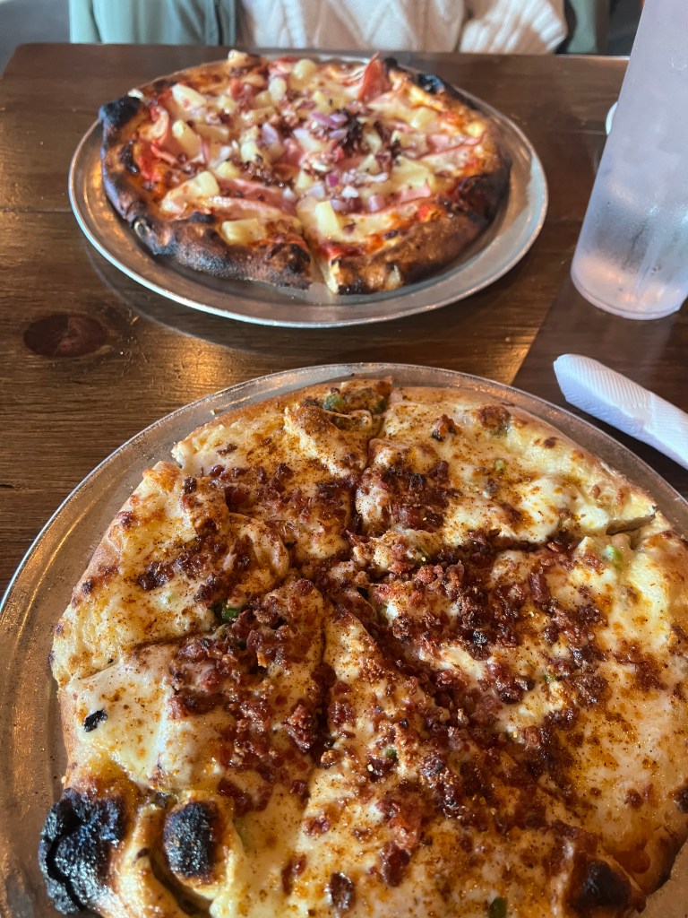 Next came the main dish and I was eagerly anticipating the pizza I ordered this time, which was a ‘Jalapeno Chipotle Chicken pizza’ with alfredo sauce, chipotle chicken, cheddar cheese, bacon, jalapenos, mozzarella cheese, and chipotle seasoning. Across the table, my lovely girlfriend ordered a ‘Carribean pizza’ that had marinara, ham, pineapple, mozzarella, and then she added on bacon and red onions. Oh my goodness, these were some of the best pizzas I have ever had and that says a lot because I have consumed A LOT in my lifetime. I could rave about this pizza, from the spiciness to the gooeyness of the cheese to the softness of the crust. Everything about this pizza made me feel warm inside. I had to take about half of it home because of how filling it was.