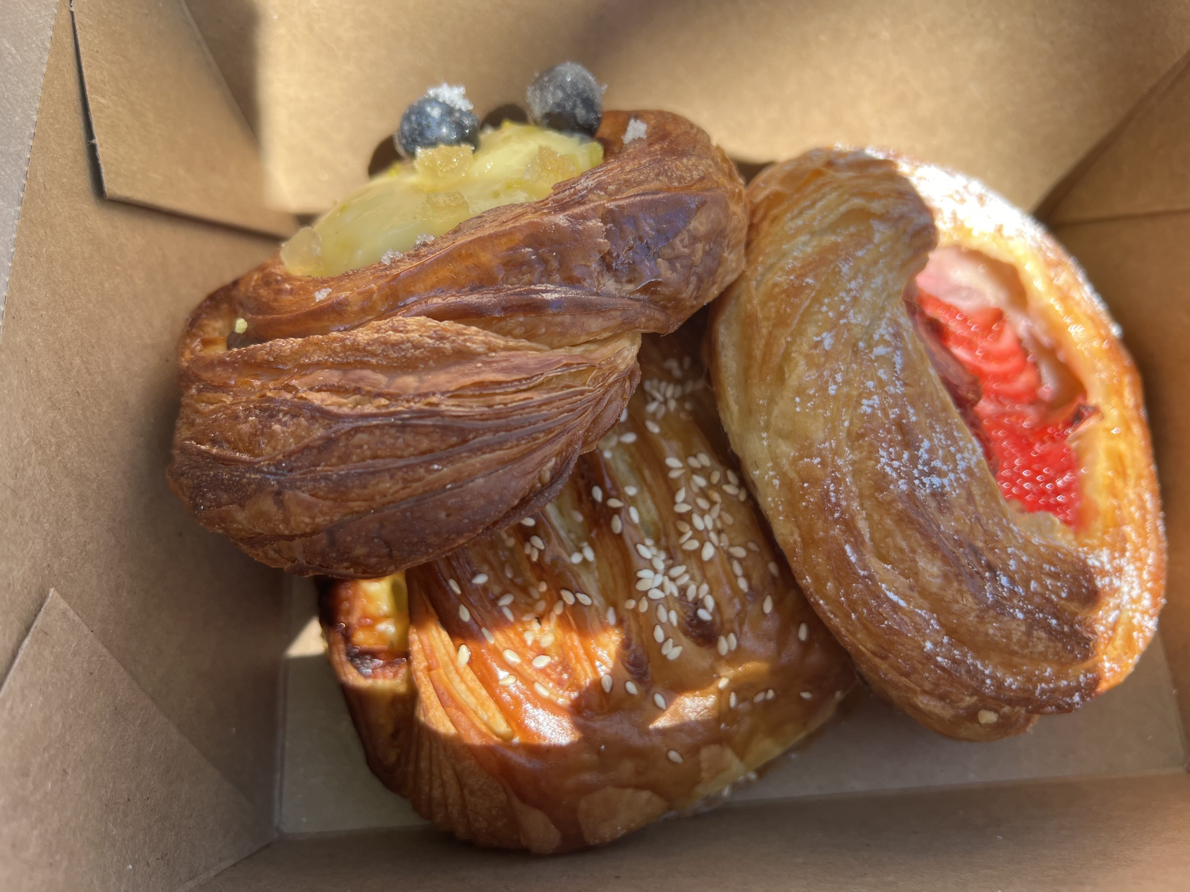 Blueberry cheese danish, strawberry danish, and ham and cheese croissant